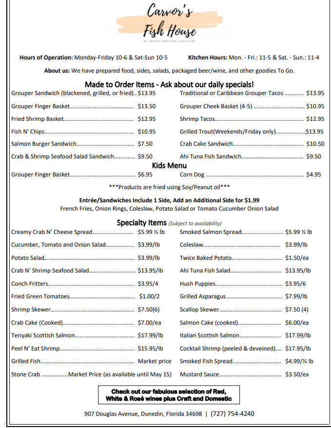 Carvor’s Fish House opened in June of 2018 as an expansion of Jensen Brother’s Seafood. Carvor’s has all sorts of prepared dishes as well as serves lunch every day! We are located at 907 Douglas Avenue (directly adjacent to Jensen Brother’s) and operates everyday of the week. Lunch is served 11-5 PM throughout the week, and 11-4 PM on the weekends! We also have packaged beer and bottles of wine, which you can enjoy on the porch or take it to go!